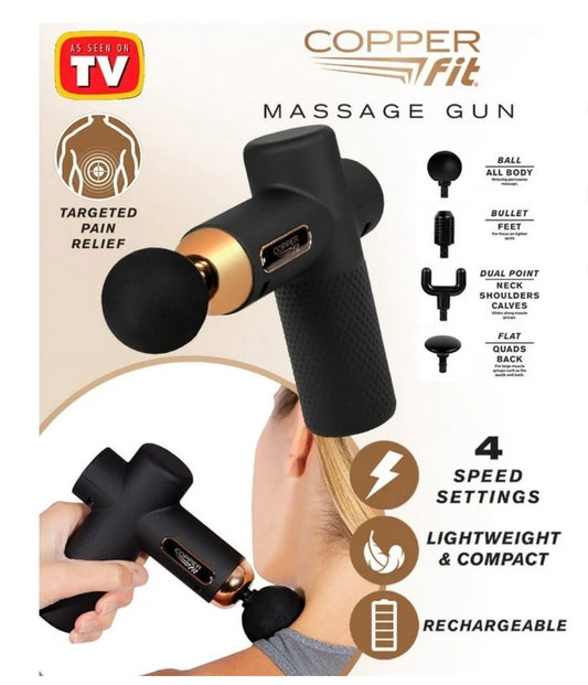 Copper Fit Percussion Massage Gun with 4 Attachments, Cordless, Rechargeable, Compact, Portable (Black) (New in Box)