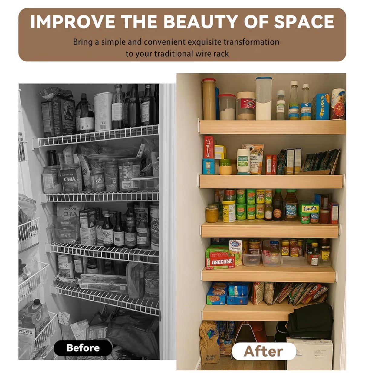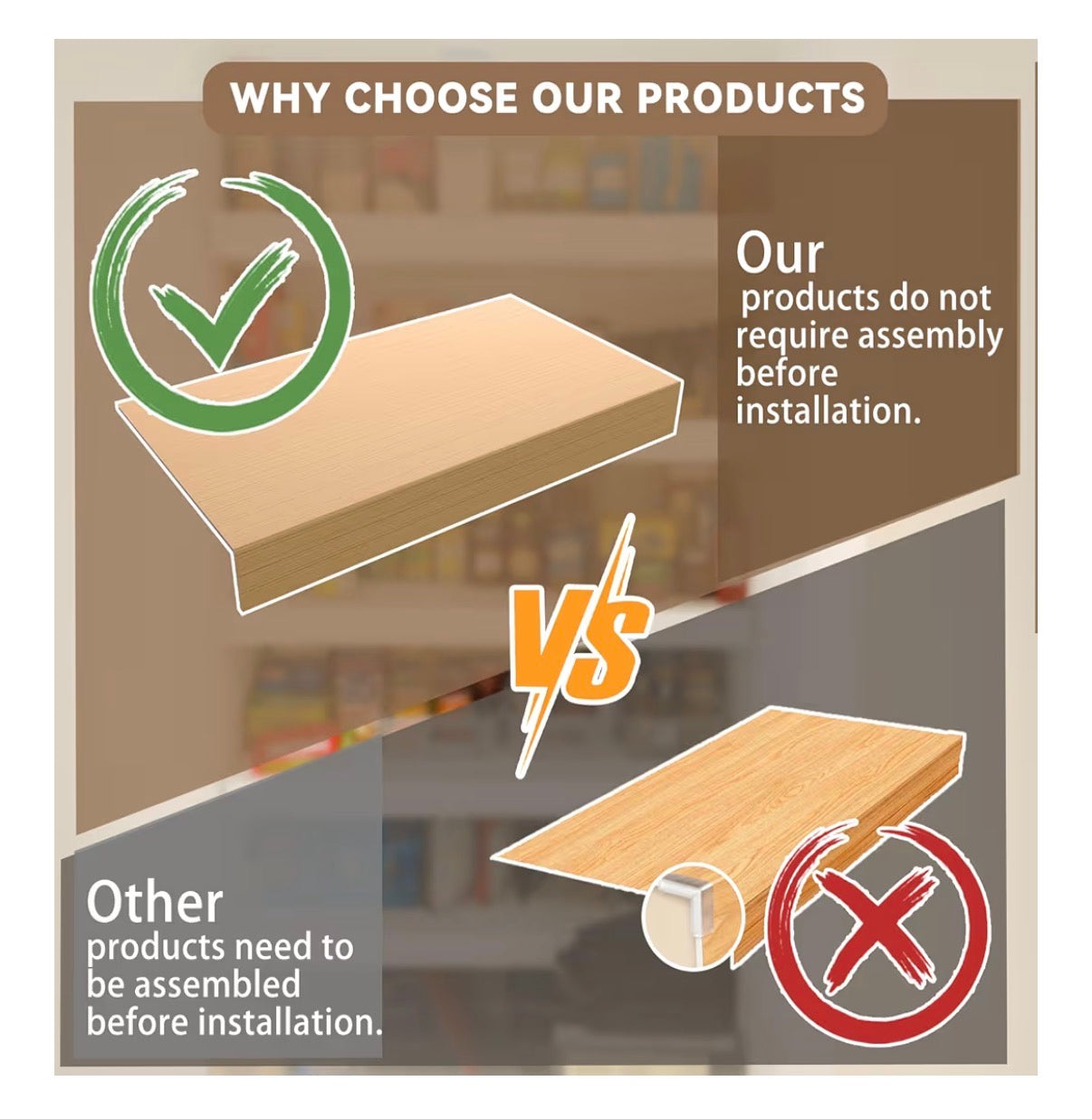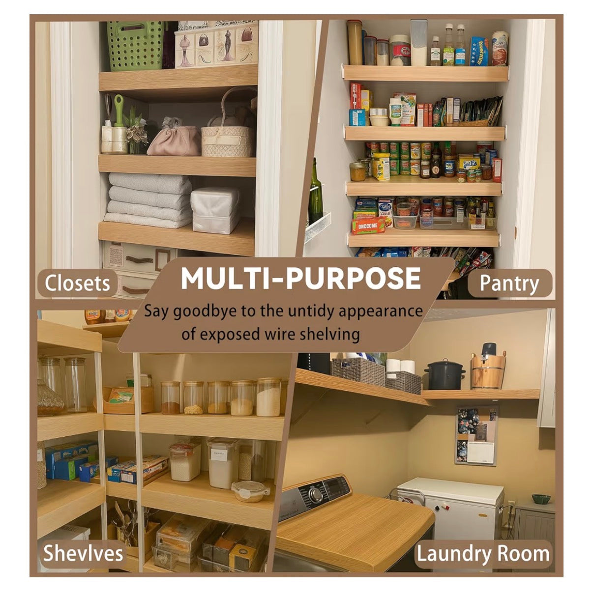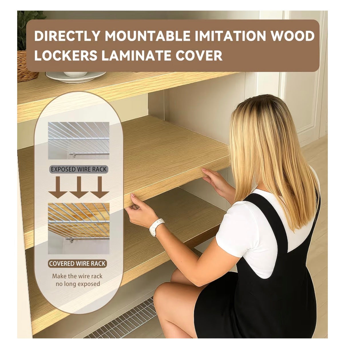 Imitation Wood Grain Finish, No Installation Needed Wood-look finish adds a clean touch. Simply place directly on wire shelf u2013 no clips or tools required. Available in white and other wood textures to match your kitchen or closet style