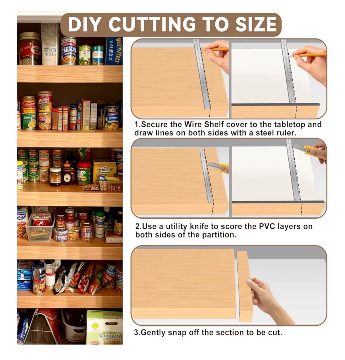 Durable 0.3" Thick PVC Composite Material Made from waterproof, odorless, scratch-resistant PVC. Holds up to 40 lbs evenly without bending. Ideal for family pantry, small business storage, or rental home shelving