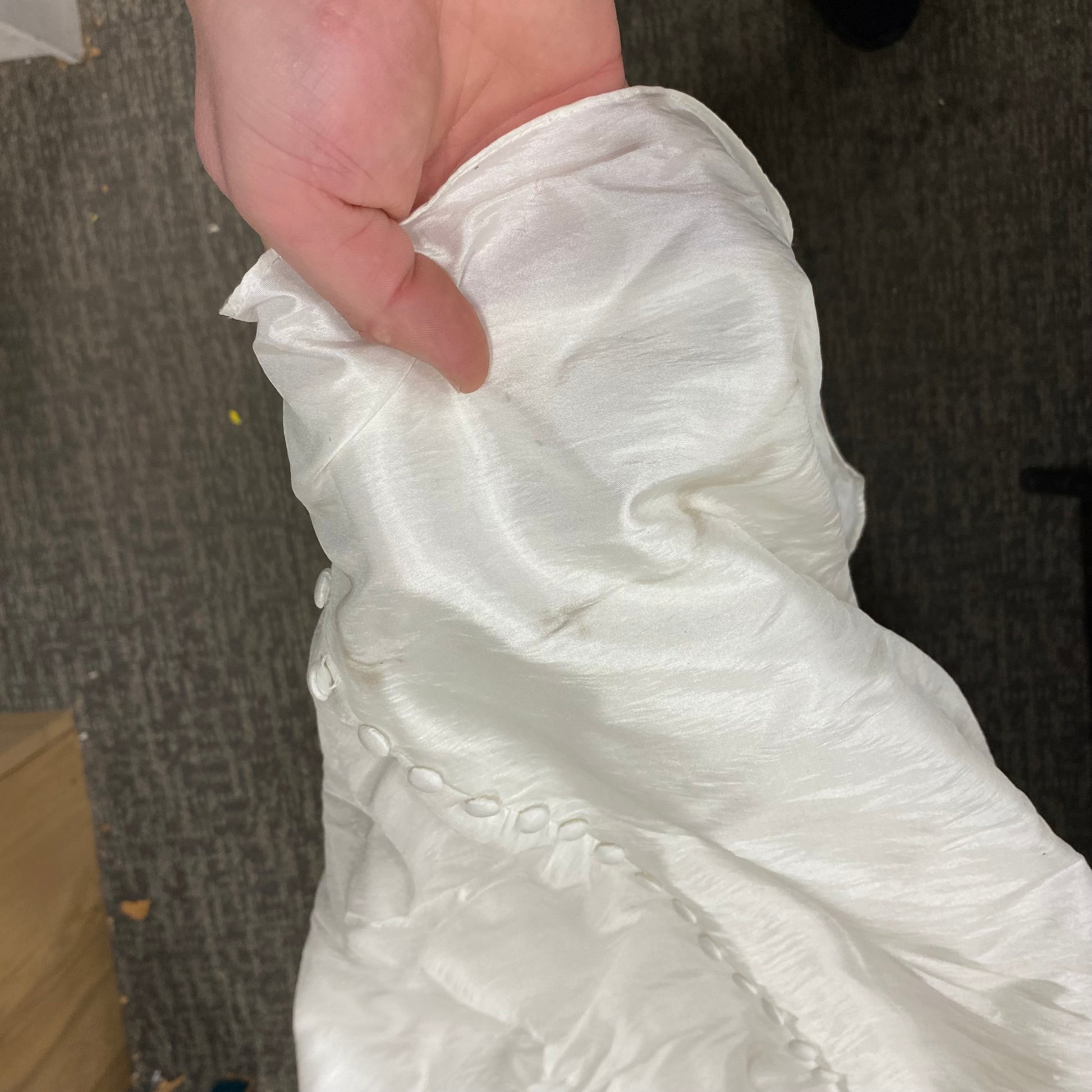 This is a pre-owned size 12, in very good condition. There are some light stains on the train. The bodice and waistline are accentuated with gathers that flatter by giving a slimming effect. Small rows of beads are delicately scattered to give the gown some sparkle and shine. Silky taffeta covered buttons line the back of the gown to the end of the train.