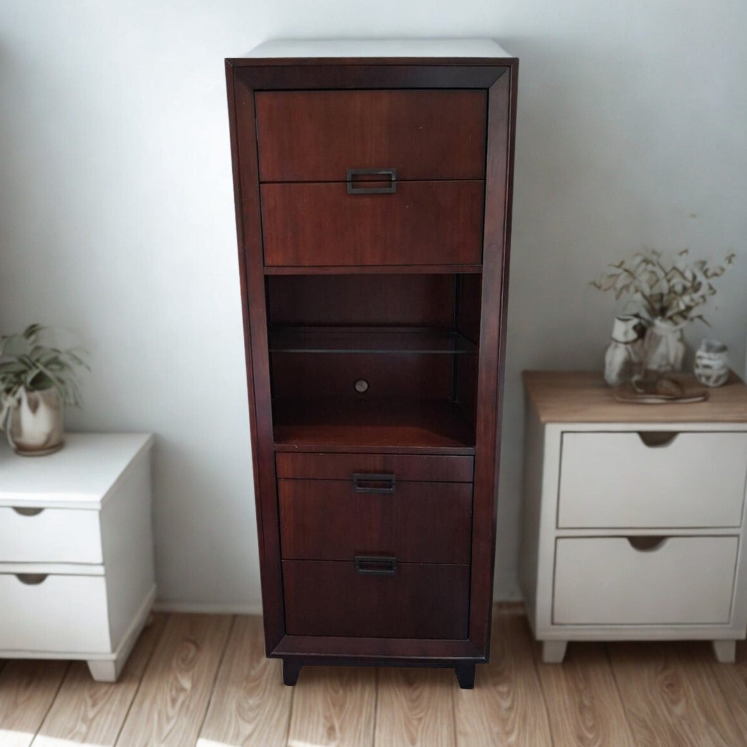 This pair of furniture pieces are the Vista King Nightstand Piers from Casana Furniture. A central open area with a glass shelf, often used for display or as a built-in nightstand surface. Features rear grommets to keep appliance and charging wires organized. Includes multiple drawers with modern rectangular metal pulls.