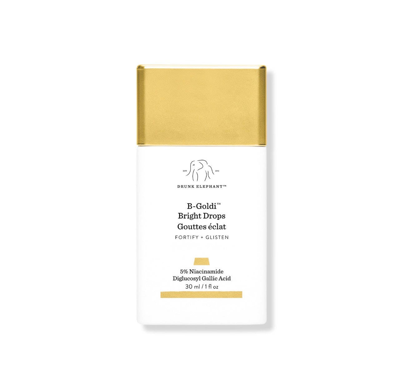 Drunk Elephant's B-Goldi Bright Drops with Niacinamide is an illuminating, barrier-strengthening serum with 5% niacinamide that adds an easy golden finish while evening skin's tone, improving clarity and radiance.