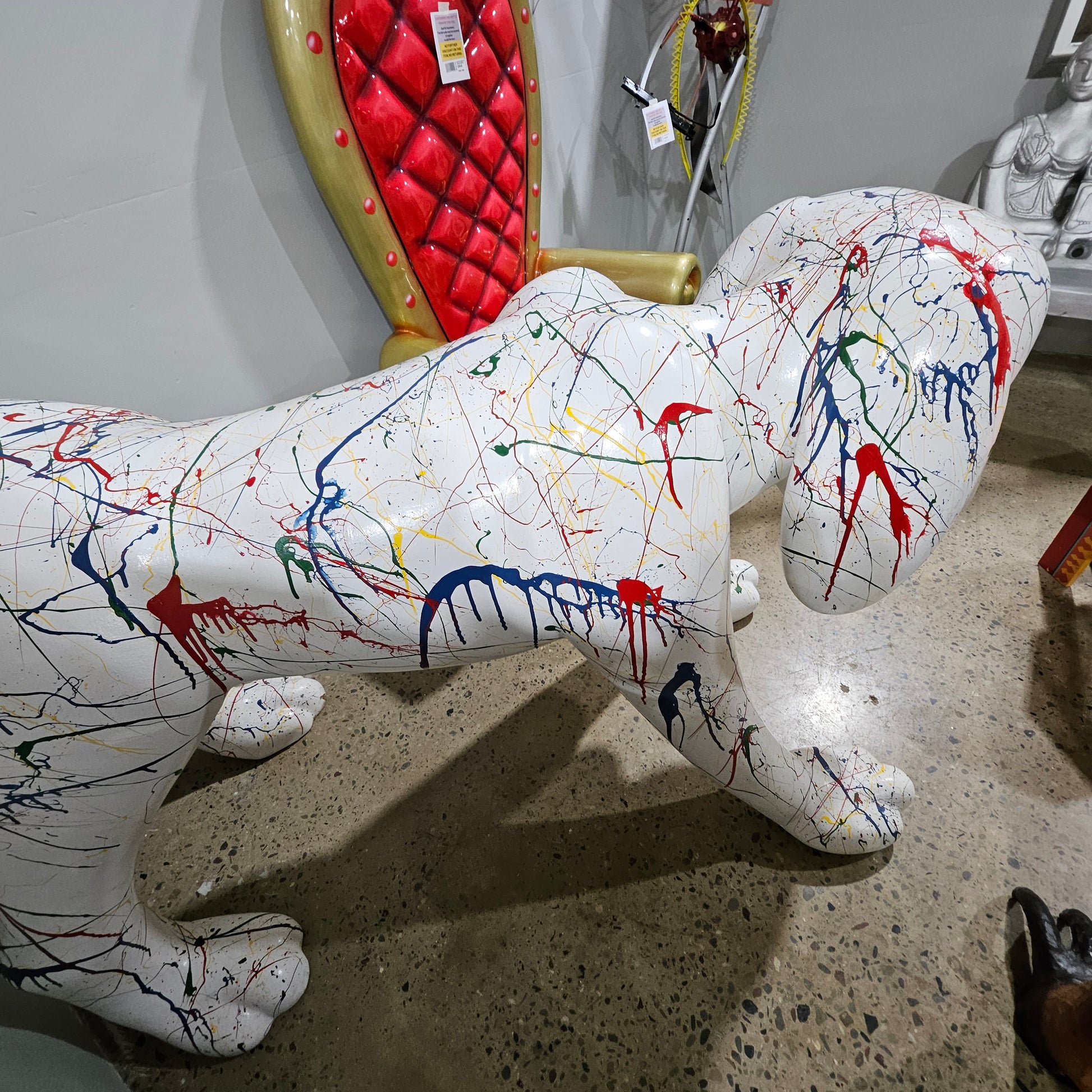 Make a statement with this extra-large decorative dog featuring a colorful paint splatter finish. Perfect for adding a fun pop of art to your home or workspace. Over 6 Feet in length.