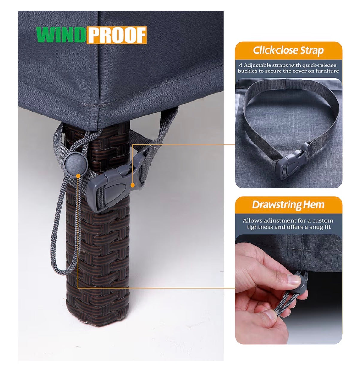 ADJUSTABLE AND WINDPROOF PATIO CHAIR COVERS: Adjustable leg straps with quick-release buckles prevent the cover from slipping or blowing away in windy conditions. Drawstring Hem for Custom Tightness: Pull the drawstring hem for custom adjustments, ensuring a snug and tight fit around your couch.