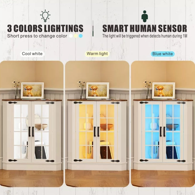 Fredees Farmhouse Corner Cabinet with LED Light, Small Bathroom Cabinet for Laundry, Living Room, Bedroom, or Kitchen, White