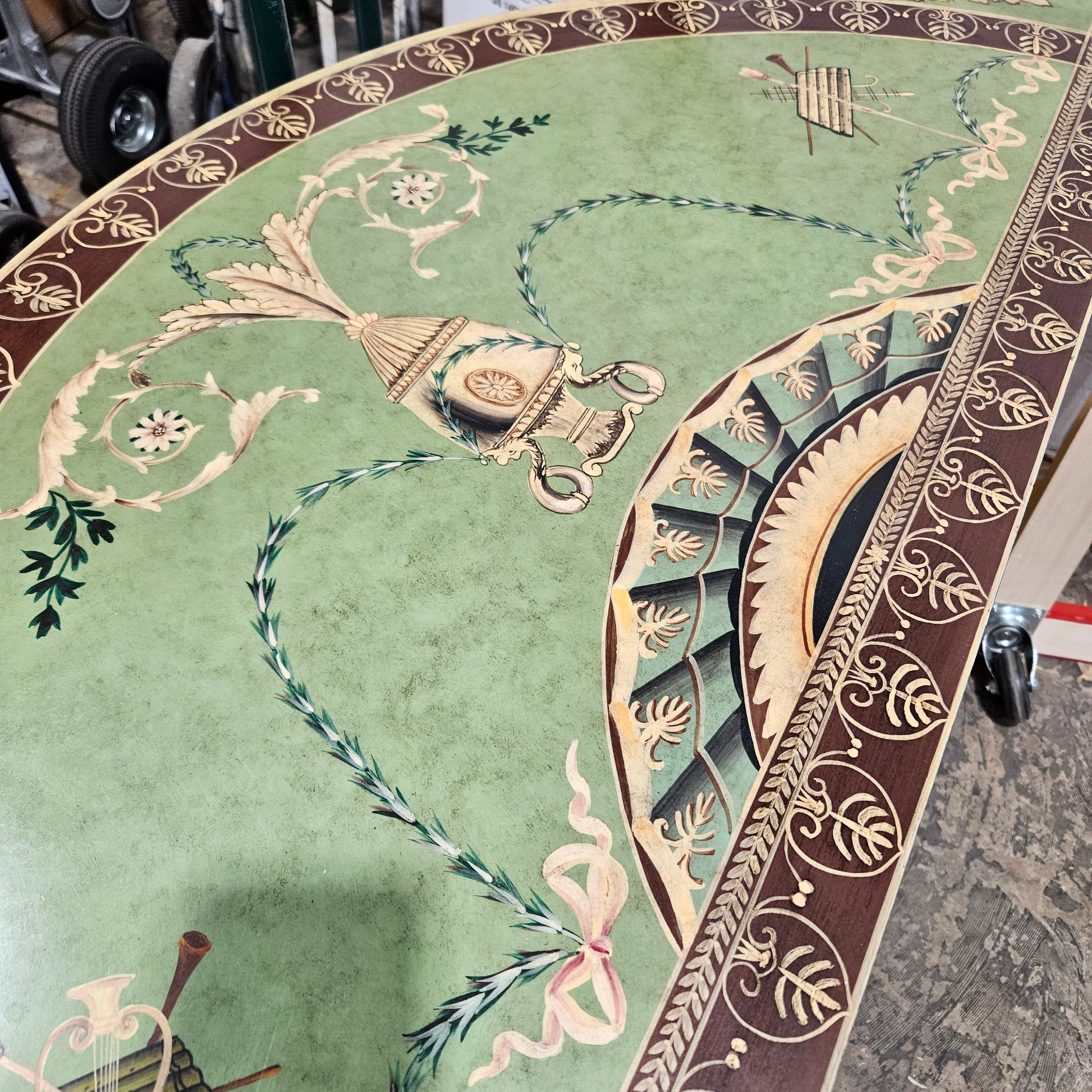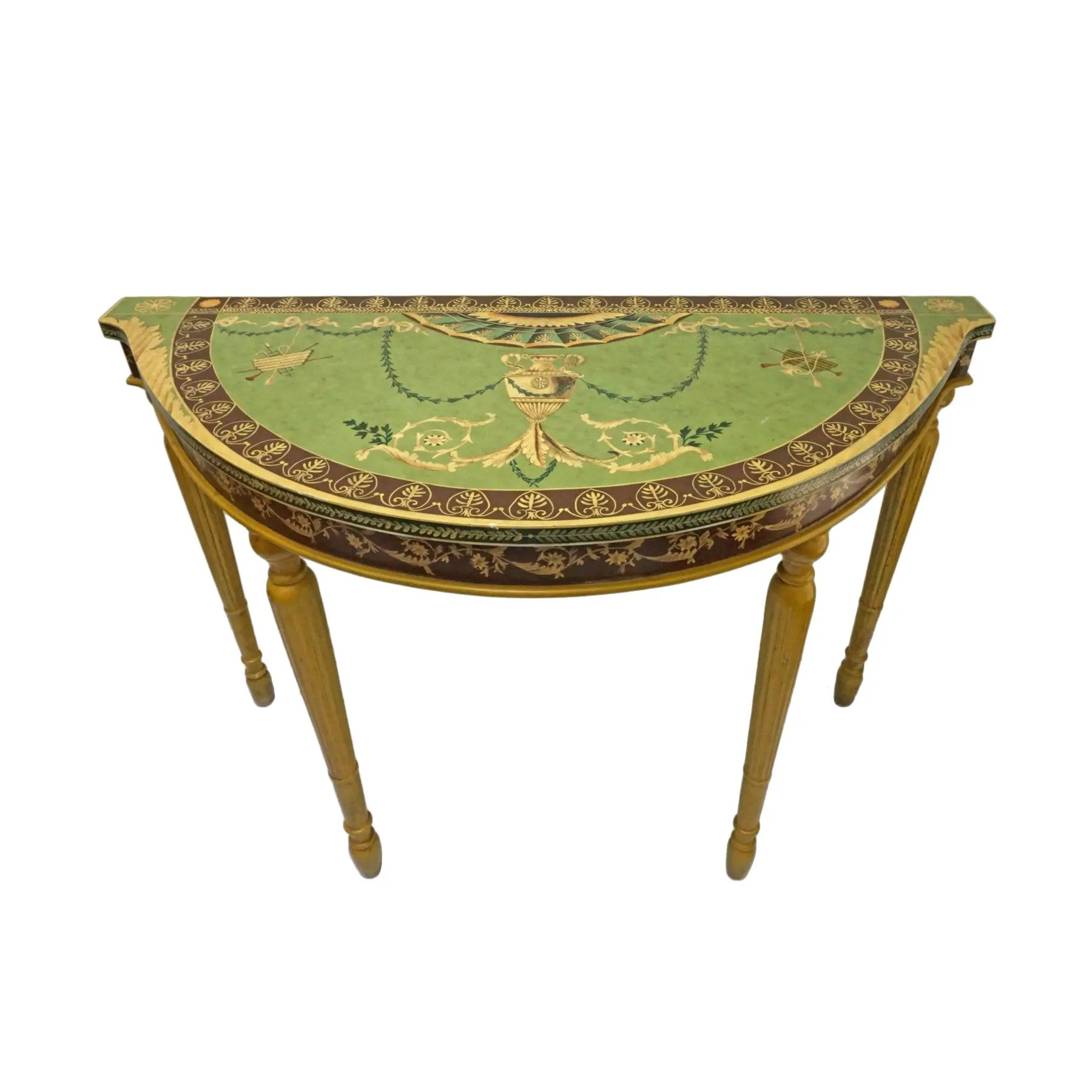Stylish demi-lune console table featuring classic Adam style detailing with Neoclassical motifs of urns and garlands in a beautifully symmetrical design. Rendered in a warm palette of green, yellow and brown, the piece showcases the elegant proportions and refined ornamentation typical of the Adam styleu2014a decorative branch of Neoclassicism developed by Scottish architect Robert Adam and his brother James Adam in the mid-18th century.