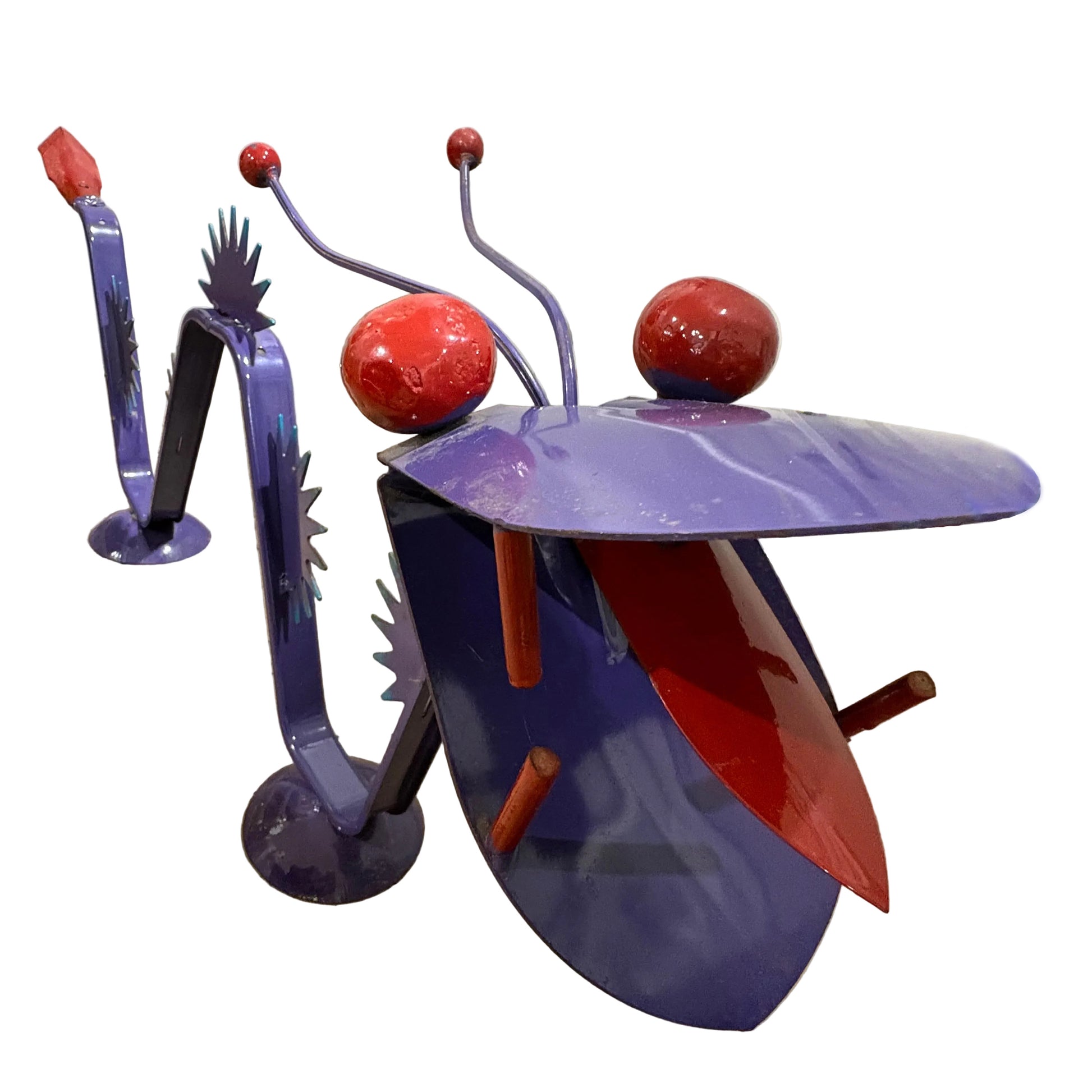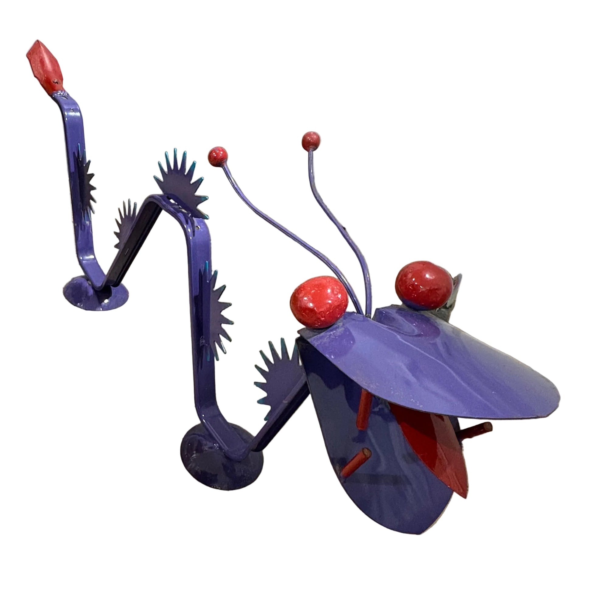 Whimsical, hand-painted metal garden sculpture designed to look like a mythical snake or dragon. Constructed from welded metal, likely repurposed scrap metal or painted steel.