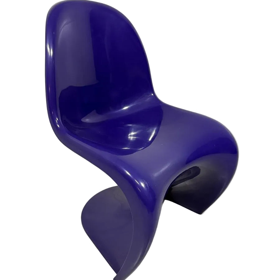This image features a blue Panton Chair, a classic piece of furniture design originally conceived by Verner Panton in 1959 and produced by Vitra starting in 1967. It is known as the first all-plastic chair made in a single piece with a cantilever design. It is considered a significant icon of 20th-century chair design. Miniatures of this chair are produced as collectibles by the Vitra Design Museum.