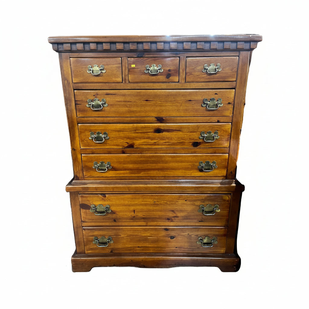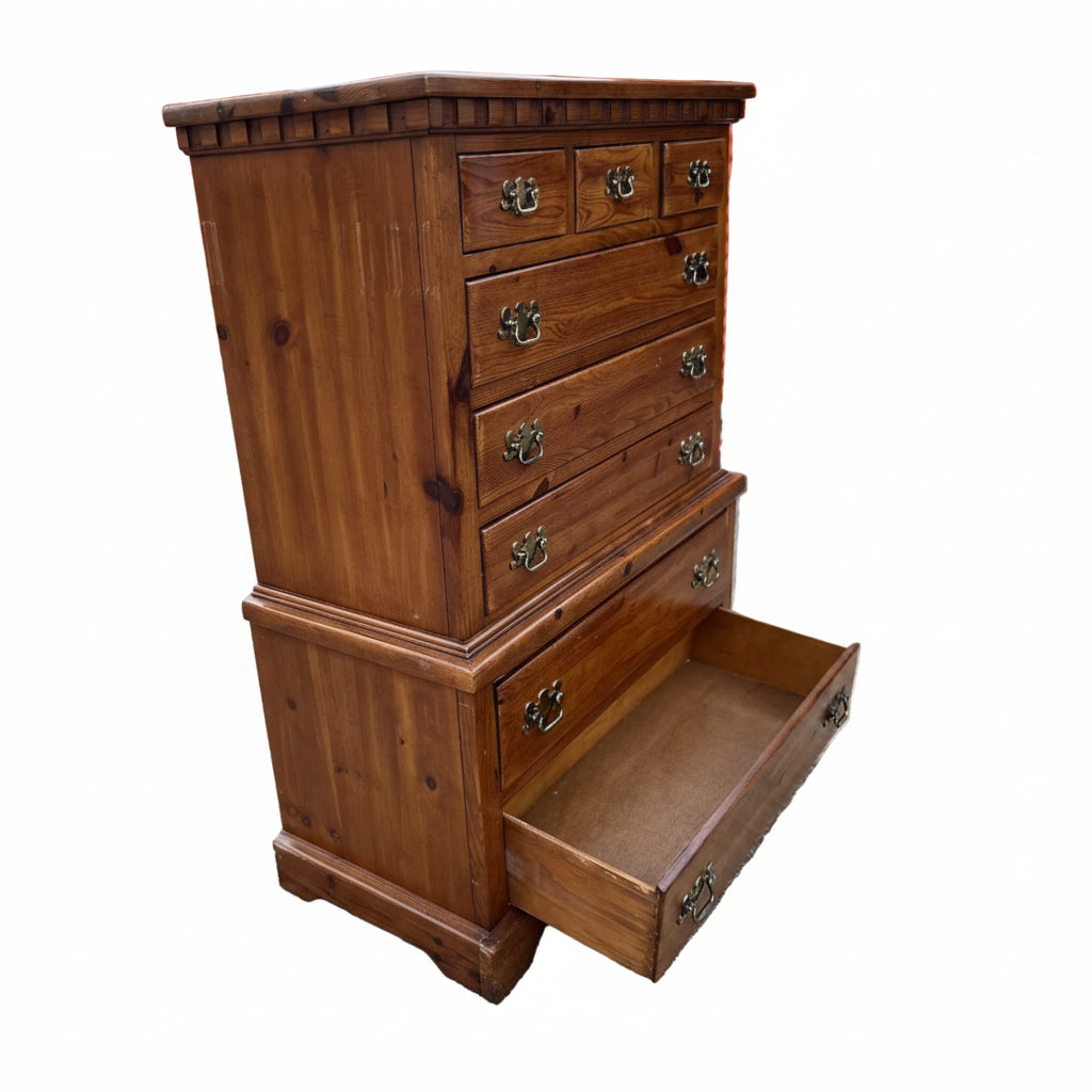 This vintage highboy-style chest is crafted from solid pine wood and features a distinctive colonial design.