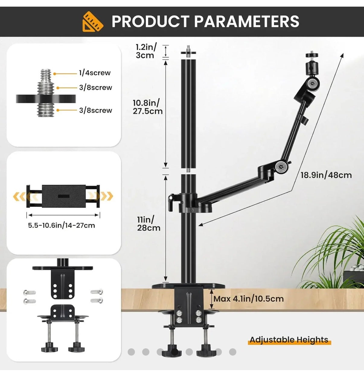 The camera arm desk mount fits a variety of devices and can be easily adjusted for optimal position. It is also equipped with secure clamps for stability, and is made of durable aluminum alloy. Simply connect the clamp and poles, adjust the height, and use the built-in screws for additional equipment.