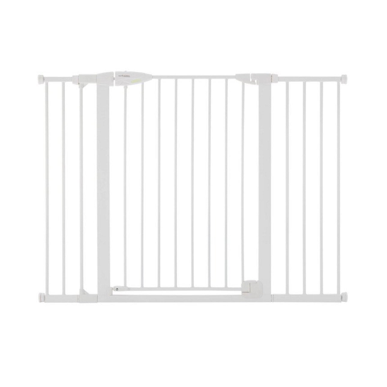 The Toddleroo by North States Extra Wide Bright Choice Gate gives parents the peace of mind their child will be safe day or night. The innovative glow-in-the-dark feature on this child gate illuminates the large easy-grip handle, giving parents the capability to see and open the gate in the dark. This safety gate pressure mounts between rooms, hallways, or doorways. Its extra-wide 22" door provides plenty of room to walk through with ease and gravity-fed hinge effortlessly closes it behind you. For those times when you want the gate to quickly remain open, just move the door past 90 degrees and the hold-open feature will kick in, preventing closure. To control the direction that the gate moves, a swing control lever allows you to decide - easily swing in one direction or allow the gate to swing in both directions when needed. The Toddleroo Extra Wide Bright Choice Gate has a crisp white finish that will compliment any home decor, while its heavy-duty steel construction is built to last. Ideal for a variety of room openings or at the bottom of stairs measuring 29.75 to 52 inches wide with three extensions included and is 30 inches high.