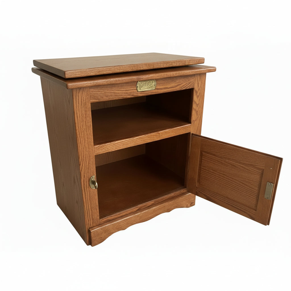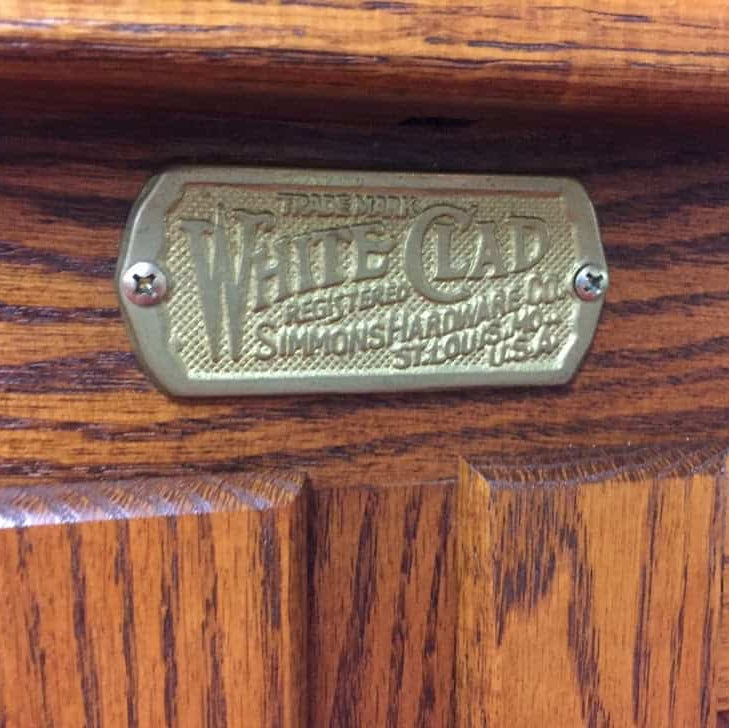 This item is a vintage oak "White Clad" Vintage Wood Table with Swivel cabinet, manufactured by the Simmons Hardware Company. It features traditional oak wood construction with brass hardware and a prominent metal nameplate.